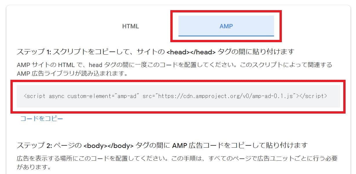 上記のタグは Adsense にログインして[広告ユニット] → 既存の広告ユニットにある広告ユニットの右にある <> [コードを取得] をクリックして [AMP] をクリックすると表示されます。