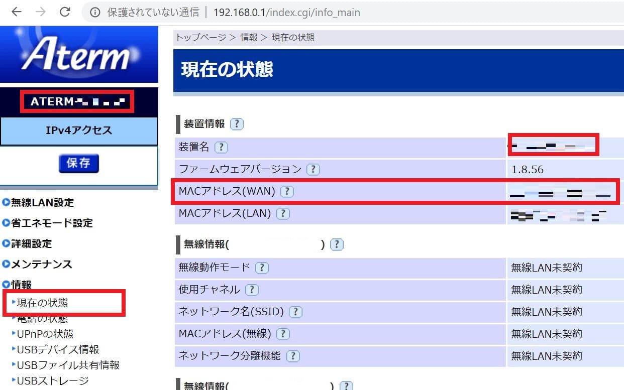 ちなみに、左メニューの「現在の情報」をクリックすればMACアドレスもわかります。