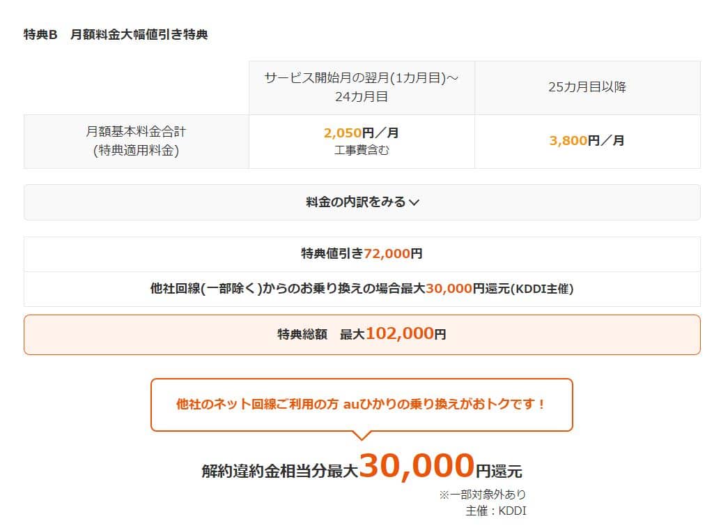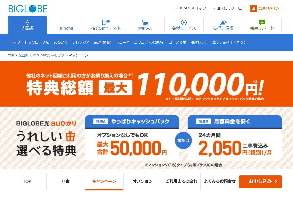 でも、BIGLOBE の公式ページにはBIGLOBE光 auひかりの料金が月々 2050円 × 24カ月と書かれていますよ?