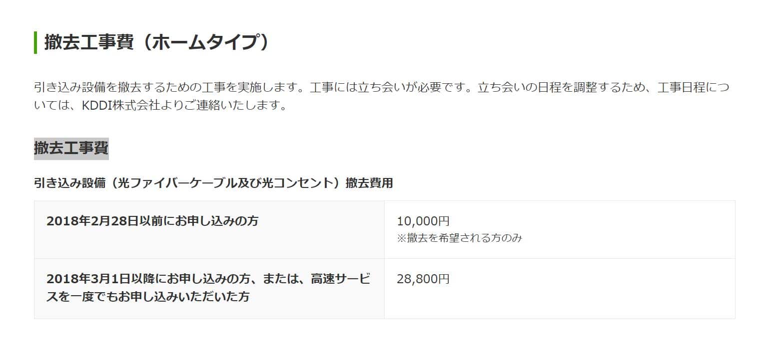auひかりの場合、撤去工事費はホームタイプ (マンションタイプでない戸建ての人) の契約にのみ「2万8800円」が解約時にかかります。
