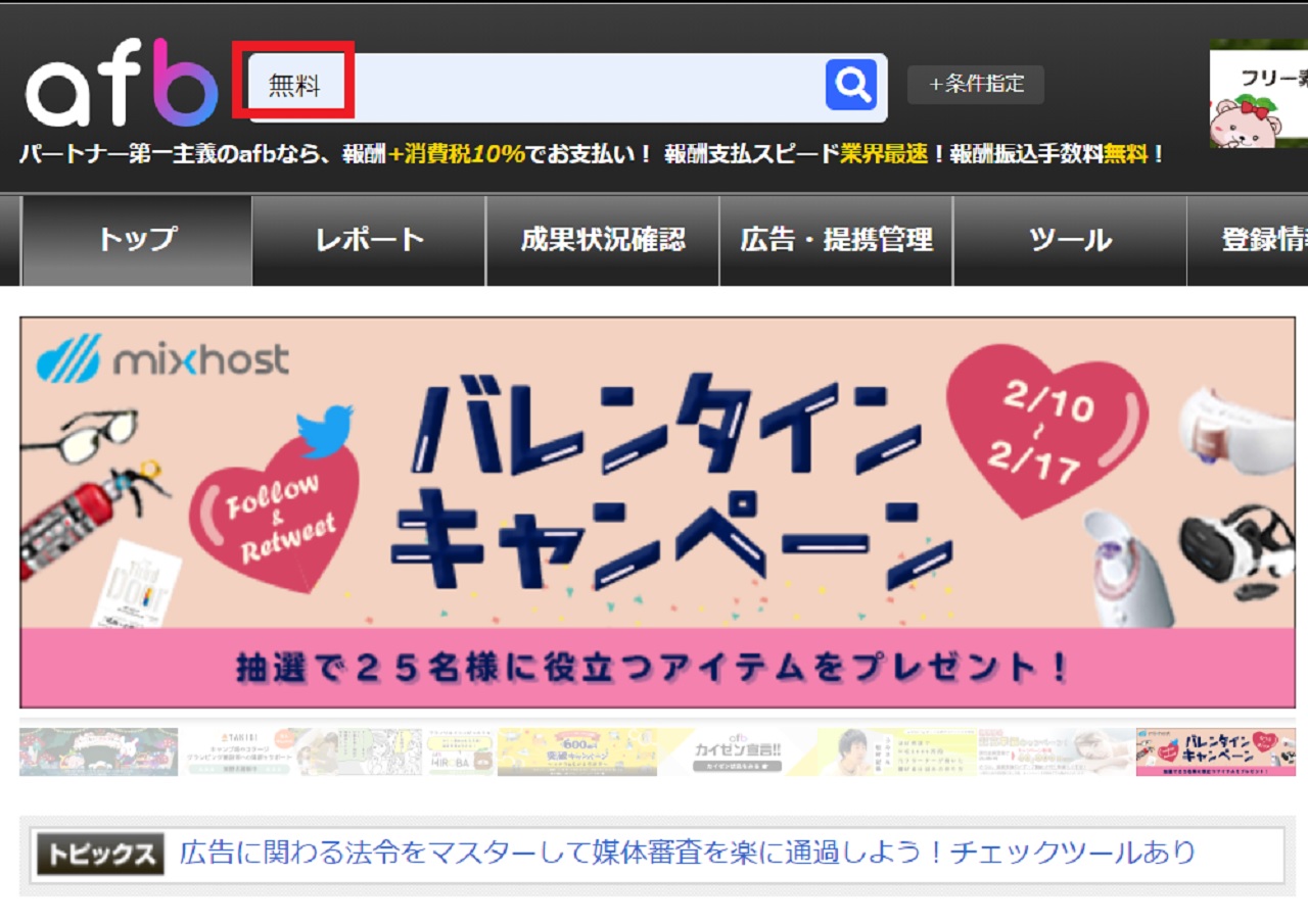 Afi-b.comの場合は、以下のように検索窓から「無料」と検索します。