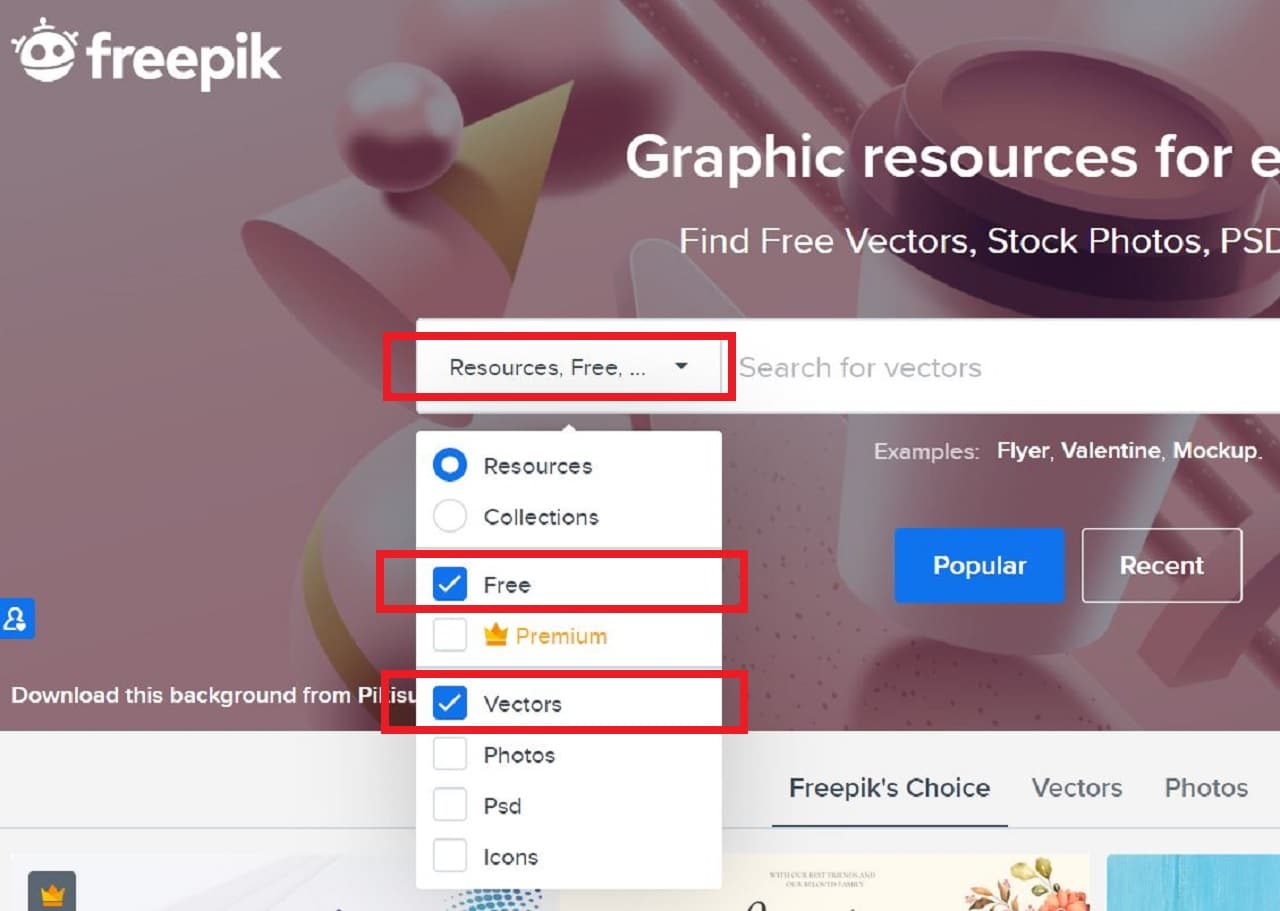 ※freepikを無料で使う場合は以下のようにFreeとVectorsにチェックを入れましょう