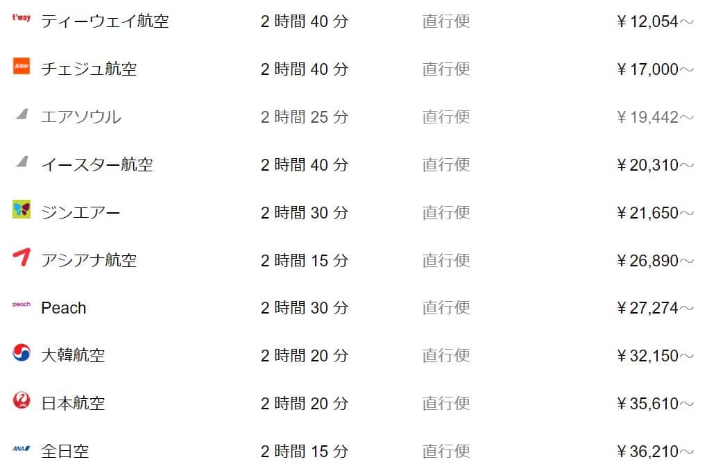 - チェジュ航空→ティーウェイ航空→ジンエアー→イースター航空→エアソウルの順で安いチケットを探す