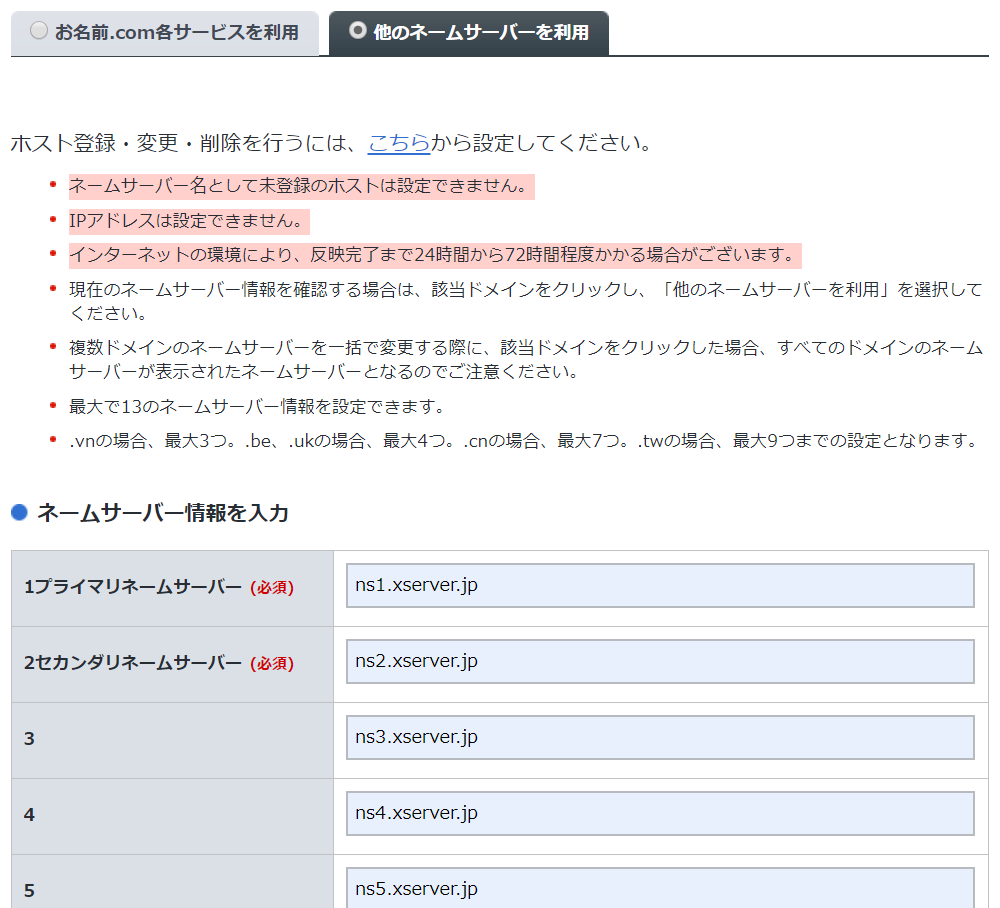 • お名前.comでドメインの DNS サーバー (ネームサーバー) の向きをエックスサーバーに変更