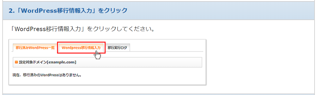 [WordPress 移行情報入力] のタブをクリックします。