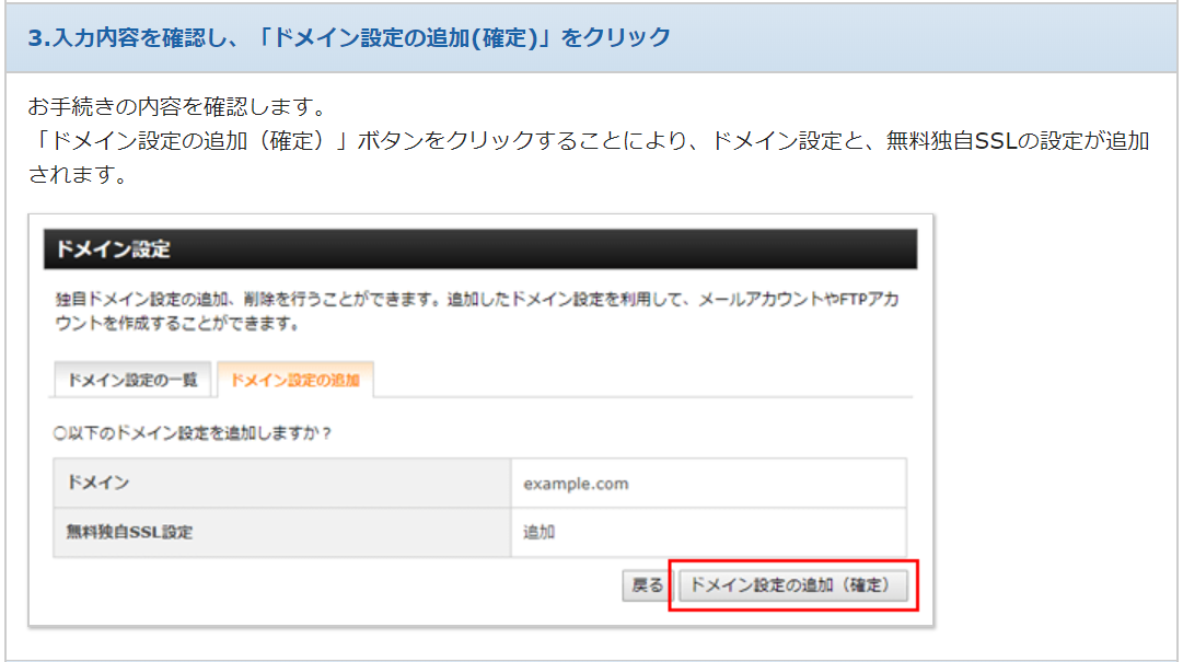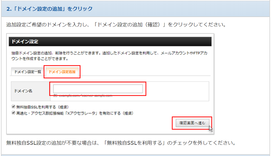 [ドメインの設定追加] のタブをクリックすると上記の画面になります。今使っているドメインをここに入力して [確認画面へ進む] をクリックします。