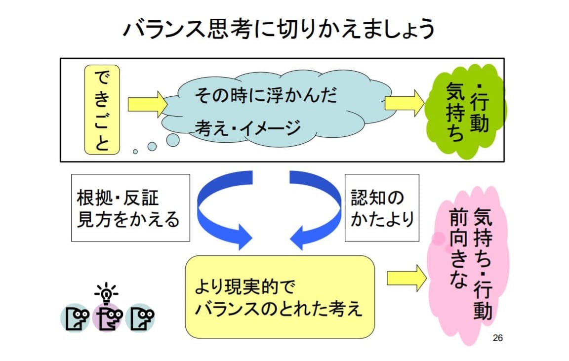 療法なんて言うと「なんだか大げさな」と思うかもしれませんが、薬を飲むわけでもなく、思考停止せずに自分で客観的な考え方を取り入れられるようになります。