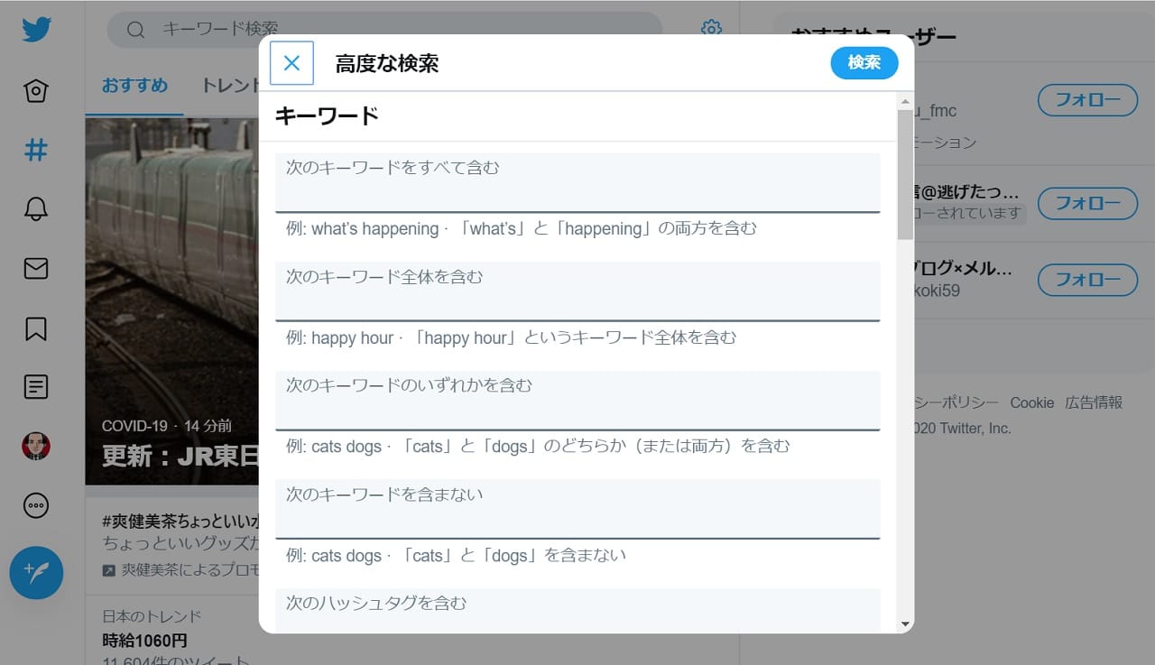 Twitterで普通に検索してもよいですし、以下のURLから移動すれば高度な検索をすることもできます。