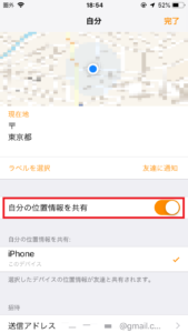 また [自分の位置情報を共有] の中にある [位置情報を共有] もオンになっていることを確認してください。なお友達を探すで共有されている相手はここにも表示されます。