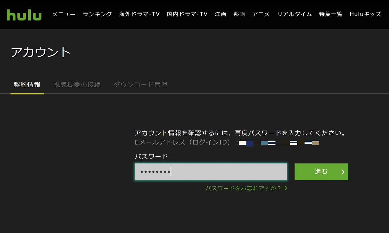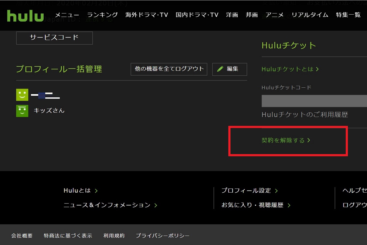 Huluにログインしたらアカウントに移動して「契約」でページ内を検索すればすぐに見つかるんです。