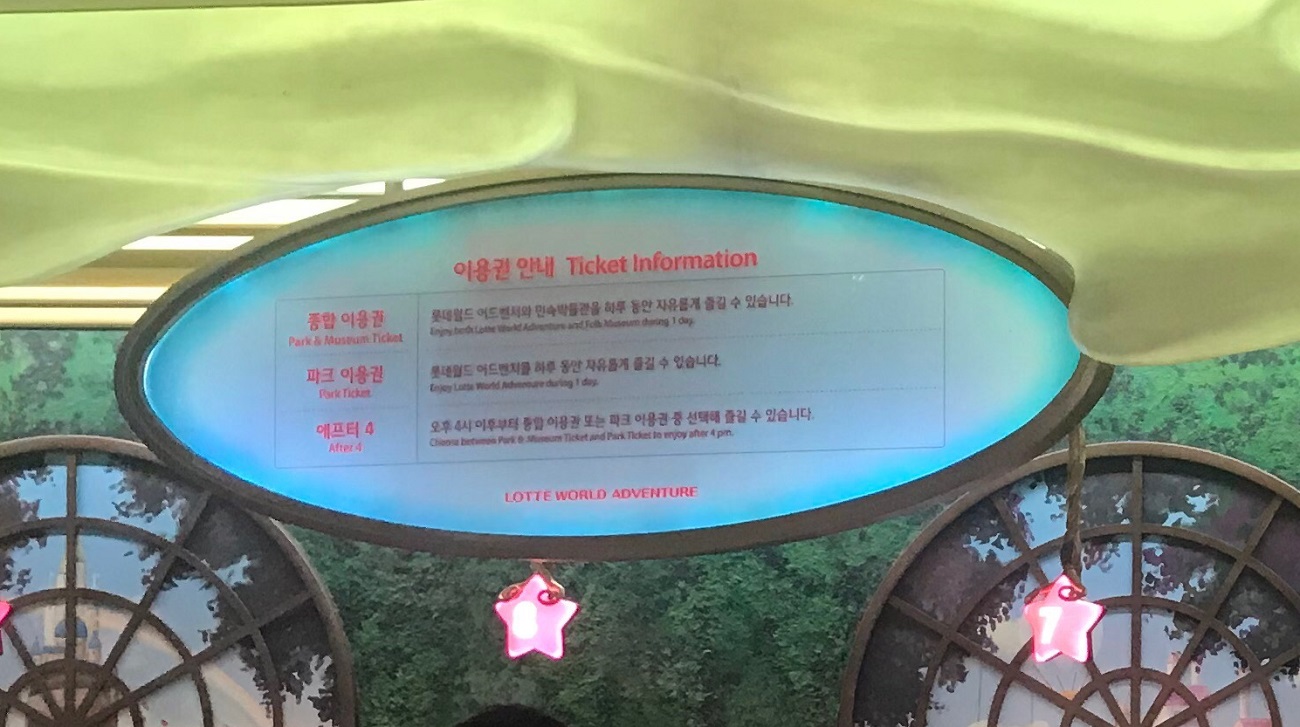 ロッテワールドのチケットカウンターには日本語の表記はありませんが、英語での記載があります。