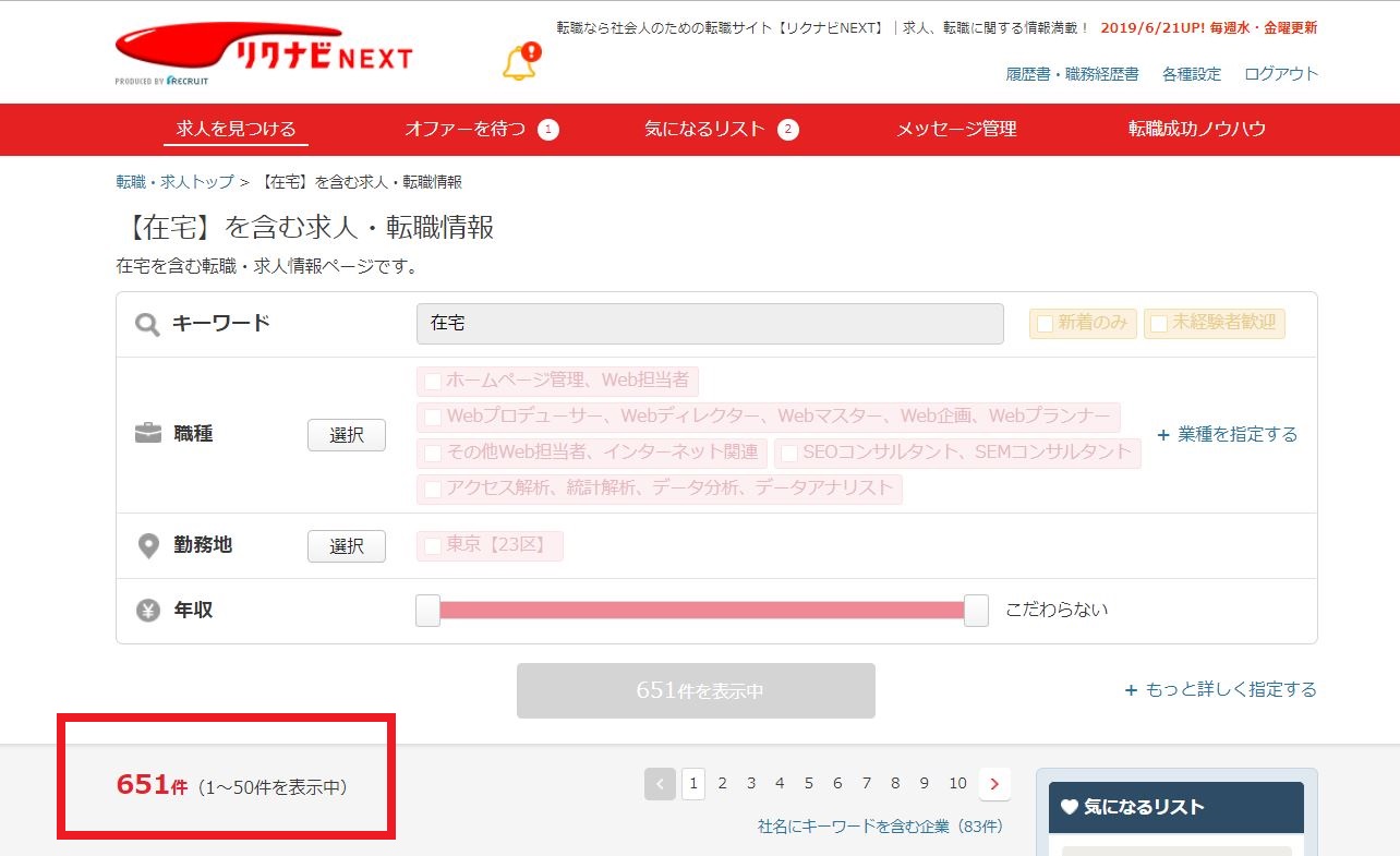 上記で出てきたWebエンジニア以外にも、在宅の仕事は沢山あります。試しに、リクナビNEXTで「在宅」で仕事を探してみると「651件」ヒットしました。