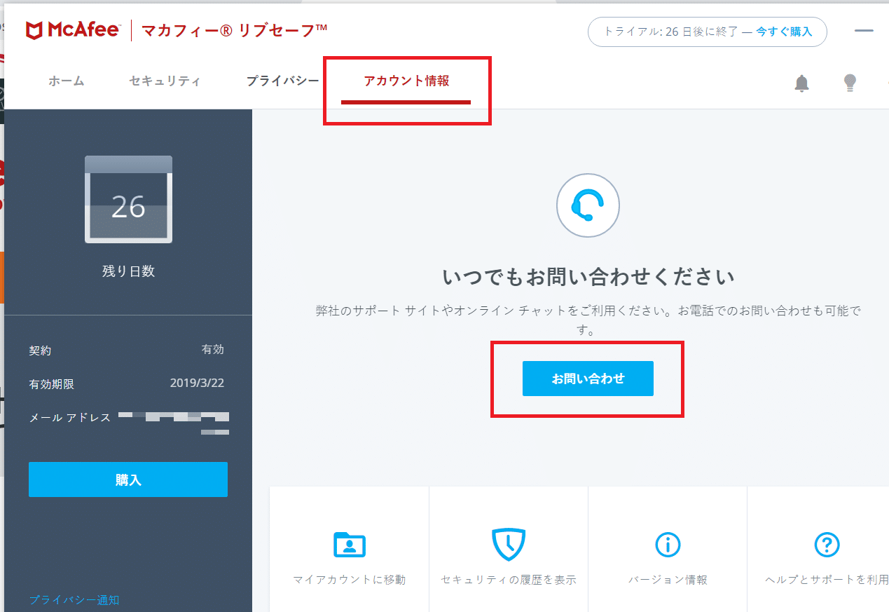 1. マカフィーリブセーフを立ち上げて [アカウント情報] のタブをクリックすると以下の画面が表示