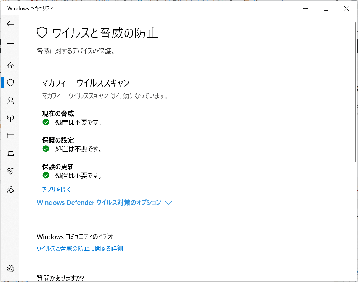 ありがとうございます。マカフィーから出ている表示であれば対処方法がいくつかございますが、Windowsセキュリティから出ている表示との事であればシステムに影響がある可能性が考えられます。