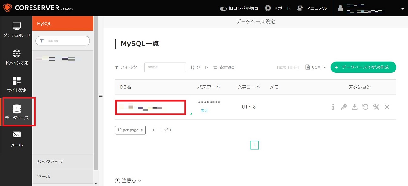 1. CORESERVER にログインして [データベース] → [DB名] をクリック