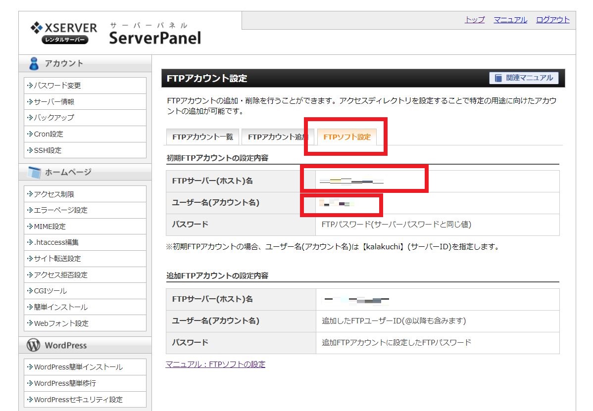 エックスサーバーの FTPサーバーのホスト名とユーザー名 (アカウント名) とパスワードは、サーバー管理画面の [FTPアカウント設定] → ドメイン名の横にある [選択する] → [FTPソフト設定] にデフォルトの設定表示されます。