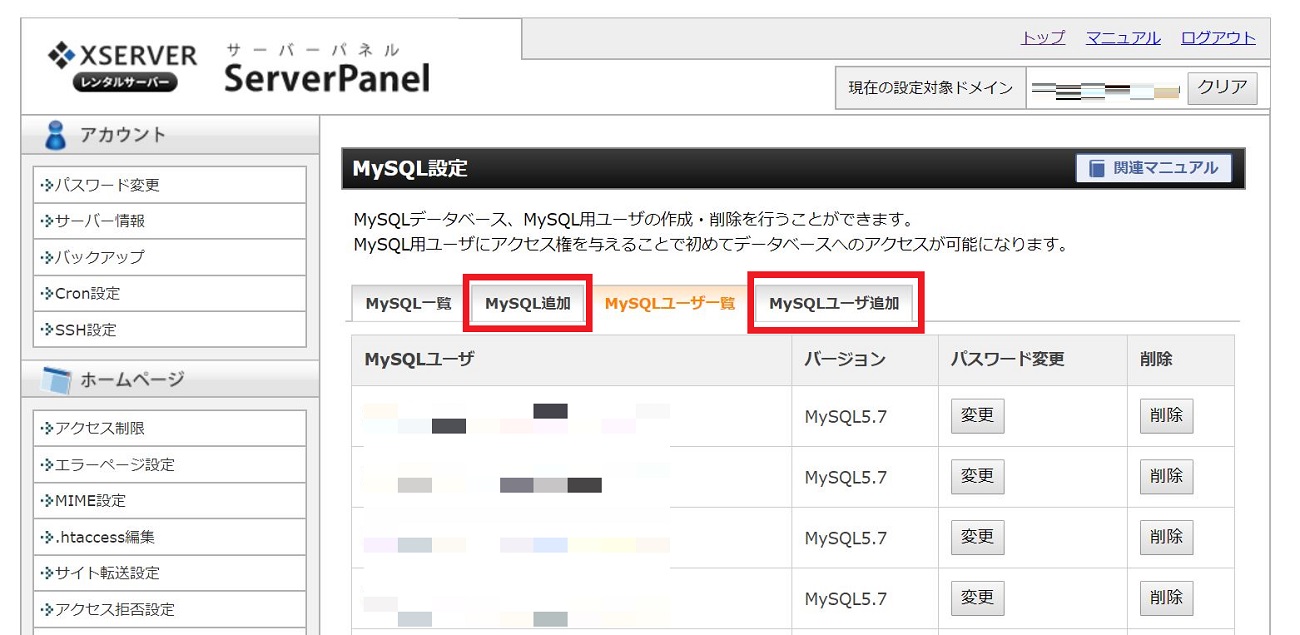 2. データベースの項目にある [MySQL設定] をクリック