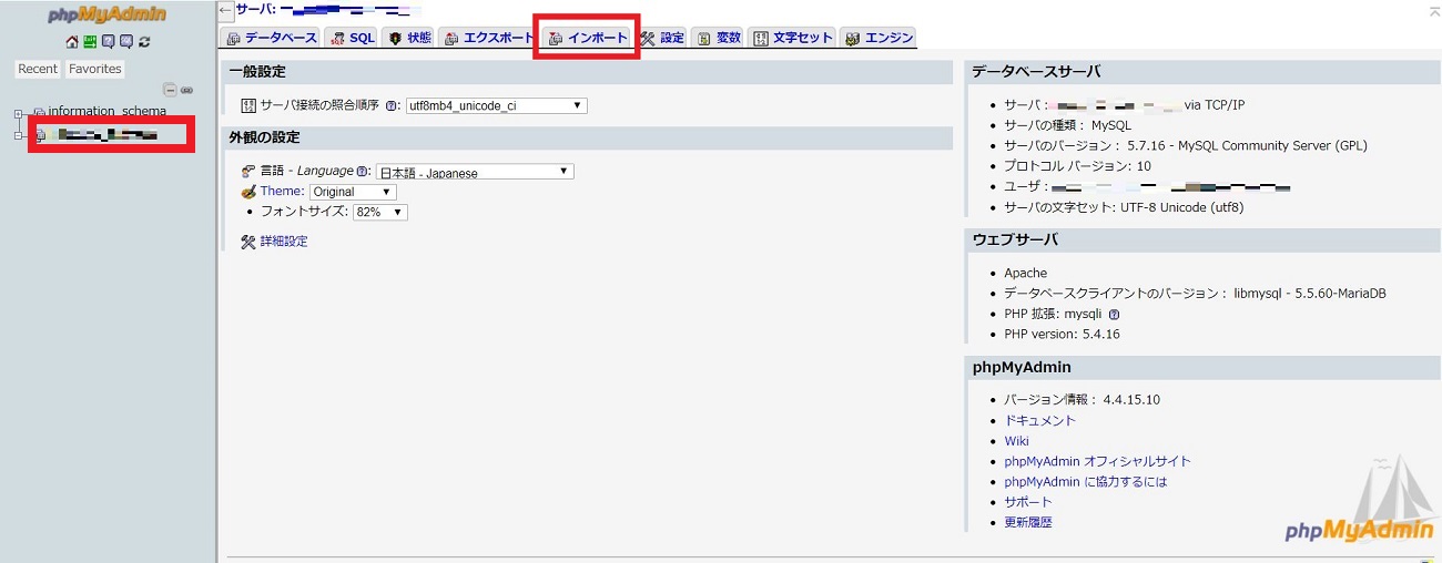CORESERVER の phpMyAdmin でエクスポートしたデータベースをエックスサーバーの phpMyAdmin にインポートします。最初はエックスサーバーでデータベースが作成されていません。