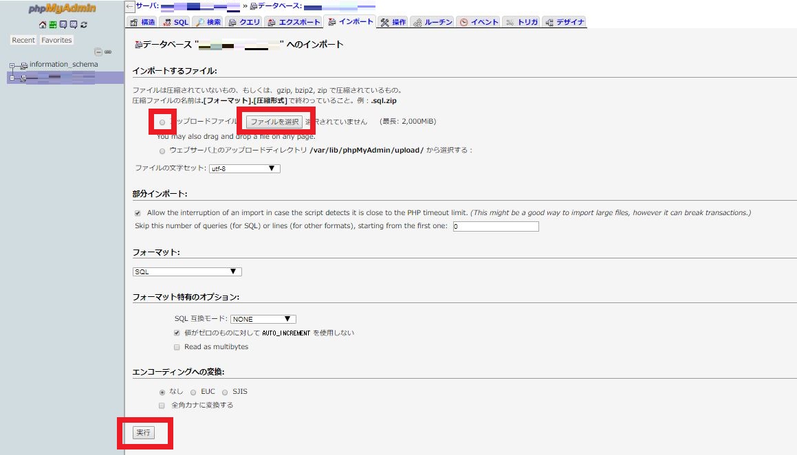 2. アップロードファイルを選択して [ファイルを選択] からエクスポートしたデータベースを選択