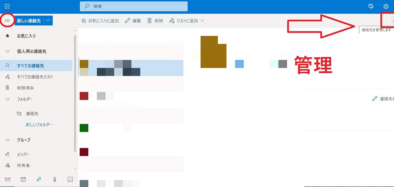 ※画面サイズによっては右上に隠れています。見えないので不安な人は左の丸で囲ったメニューをクリックしてみて下さい。[管理] が表示されます。