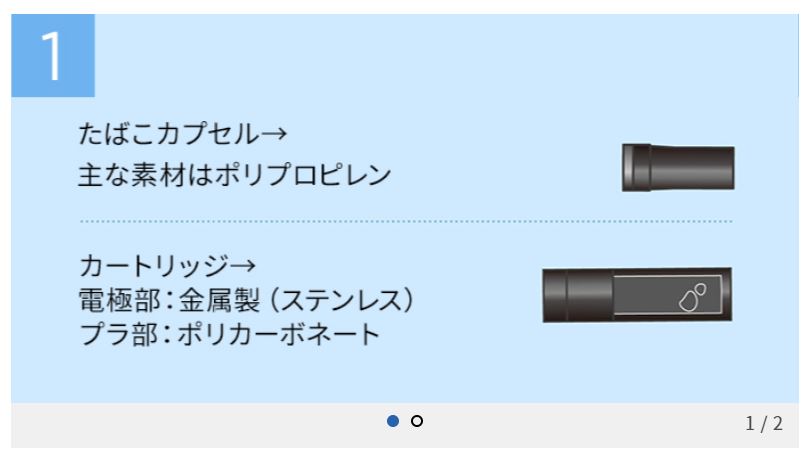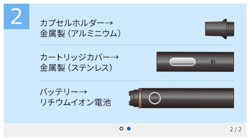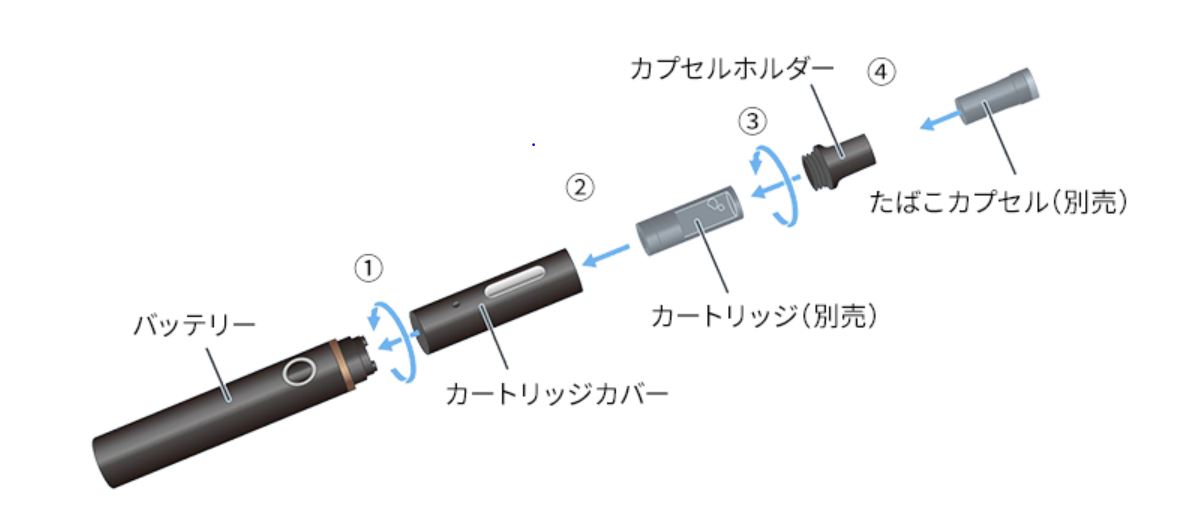 簡単に説明すると、カプセルがタバコの葉っぱ成分です。それをカートリッジ内のリキッドで蒸らして吸い込みます。加熱はバッテリーで行います。