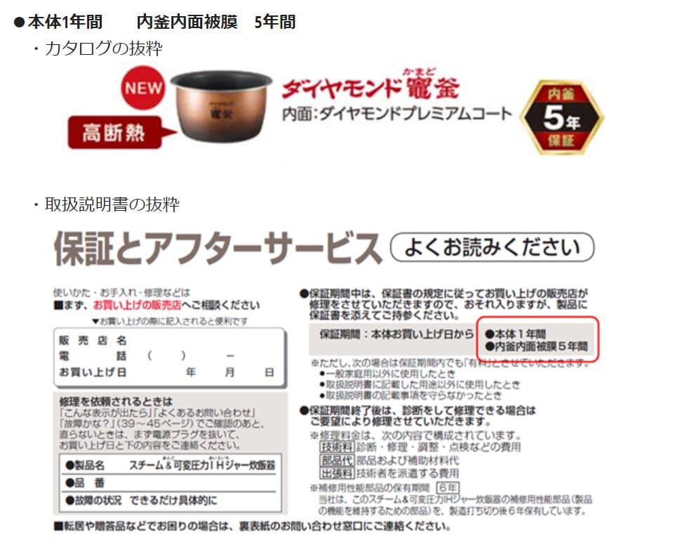 取扱説明書にある注意事項を遵守して正常な使い方をしていた場合に限り、基本的には内釜は一年保証のようです。上位機種になると3~5年ほどの保証期間になります。