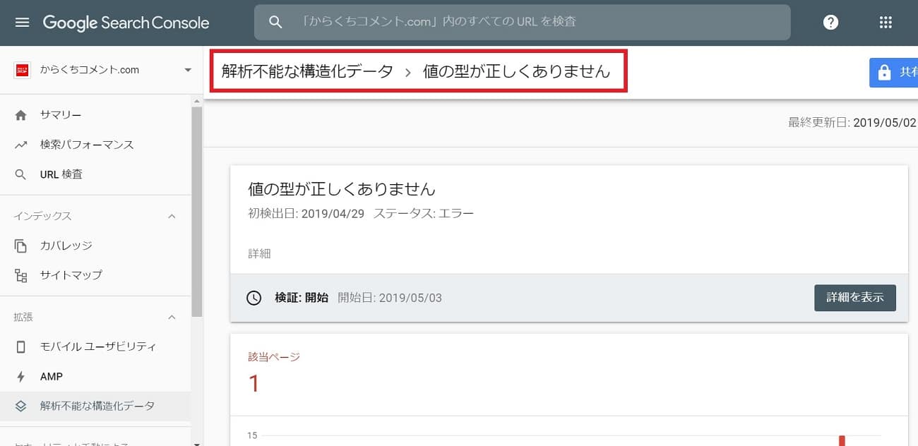 わたしが利用している Cocoon テーマをWordPressのダッシュボードから更新したところ、解析不能な構造化データ「値の型が正しくありません」のエラー画面から [修正を検証] をクリックして進むことができました。