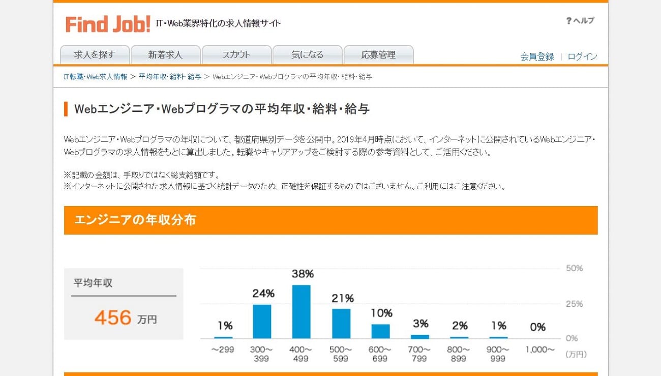 IT・Web業界に特化した求人情報サイトFind Jobの調査結果ではWebエンジニアの平均年収は 456万円となっています。Find Jobでは年収 1000万円越えは 0%でした。