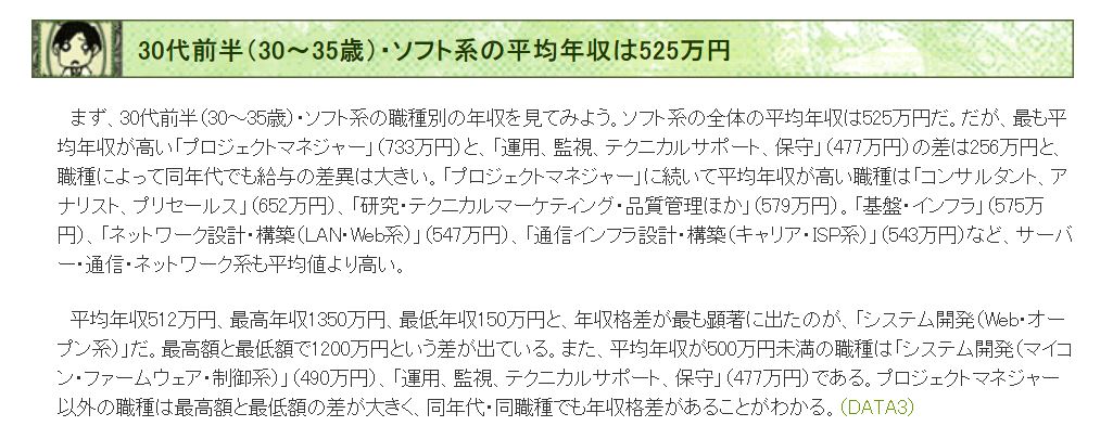 転職サイト大手のリクナビ (Tech総研が定期的に行っている年収調査) では、ソフトウェア系エンジニアの平均年収が 525万円となっています。